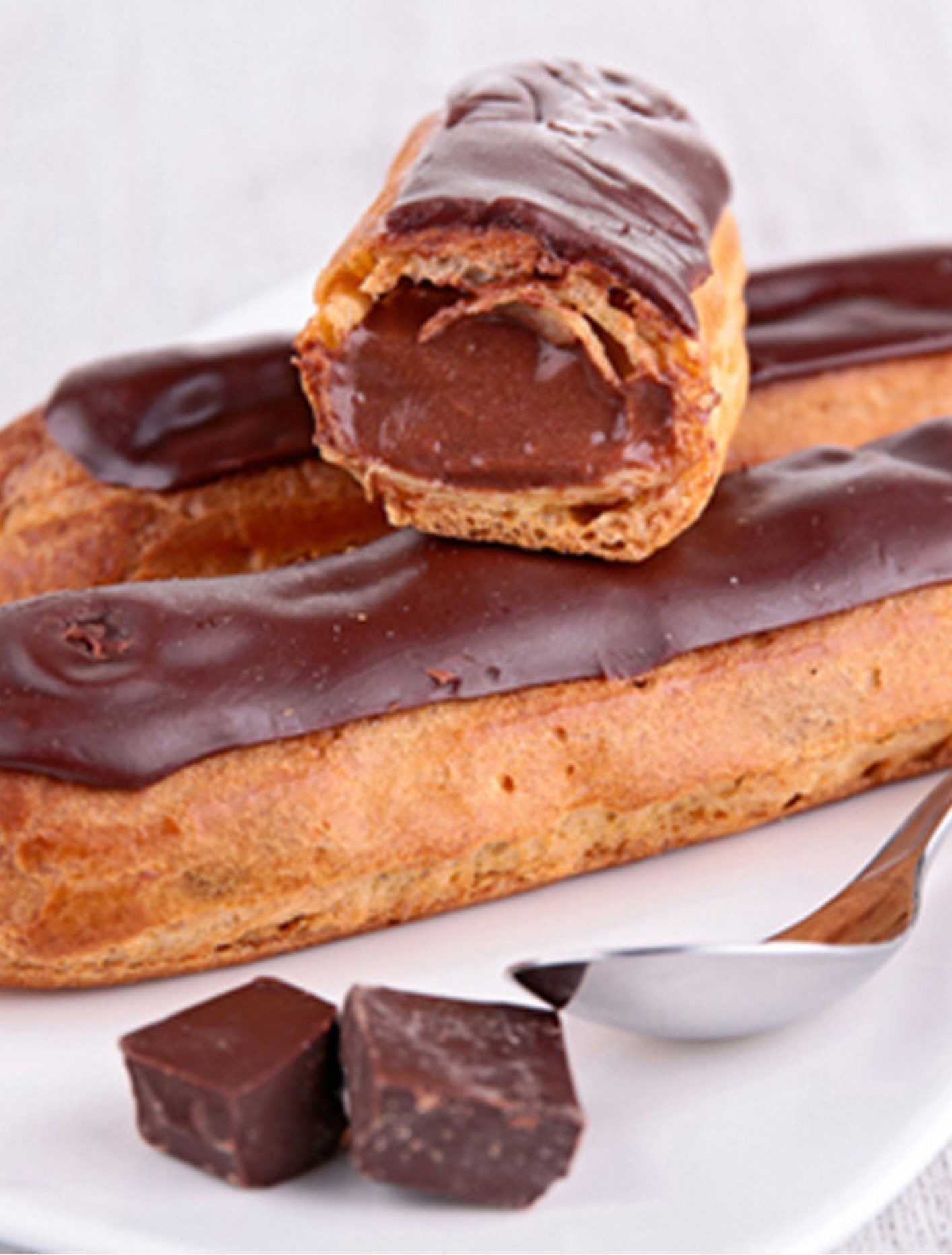 Composition : Entremets pâtissier composé d’un fourgage au chocolat, d’une pâte à choux pur beurre et d’un glaçage au chocolat